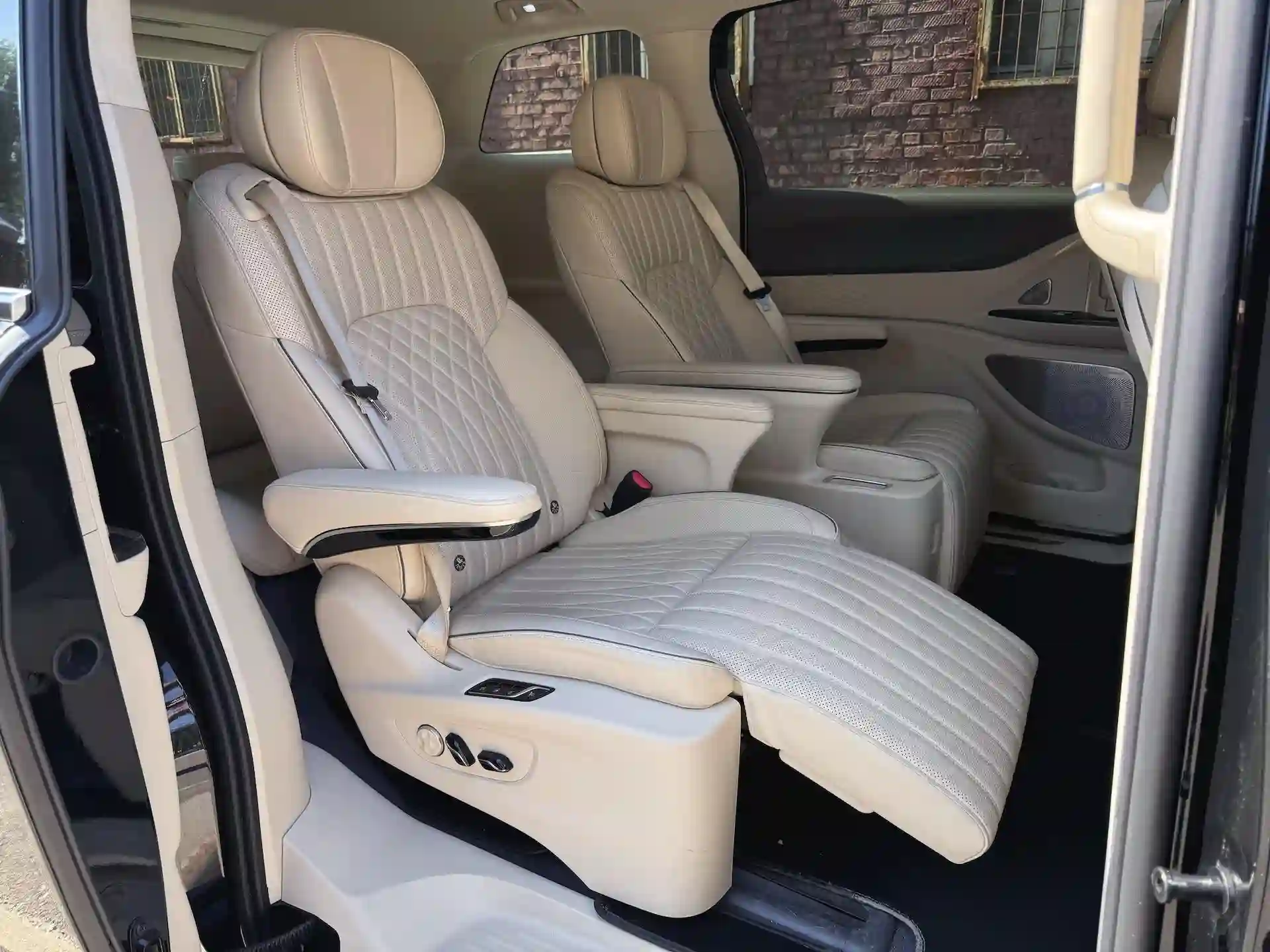 У отдельных «тронов» второго ряда есть выдвижная подставка для ног, вентиляция, подогрев, массаж… Салон отделан экокожей хорошего качества — мягкой, в меру толстой, с перфорацией и красивой прострочкой. Выглядит дорого. Впечатление усиливает ароматизатор с выбором из трех запахов. Сдвижные двери, конечно же, с электроприводом.