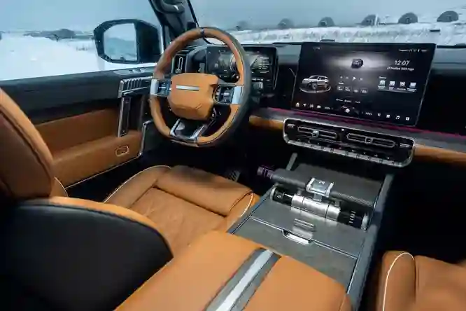 А вот от интерьера впечатления неожиданные. Посадка водителя на редкость удобна. Тумблеры на центральной консоли выполнены в авиационном стиле – один выполняет функции селектора трансмиссии, второй отвечает за настройки противобуксовочной системы, между ними – выбор уровня подвески. Графика щитка приборов – как в компьютерной игре. Дверные ручки стилизованы под пистолеты; на педаль газа нанесена пиктограмма play, на педаль тормоза – pause. Декоративные вставки из матового дерева, кожа сидений добротная, у кресел есть и подогрев, и вентиляция. Так что салон, бесспорно, хорош – с настроением. Жаль только, что для ног пассажиров второго ряда места маловато, но этот недостаток можно признать несущественным.